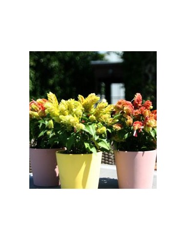 Guttata significa colgante y eso hace referencia a la inflorescencia de la planta. Las flores son en realidad florecitas tubulares blancas que no llaman en absoluto la atención. El valor ornamental está en las brácteas que protegen a las flores.